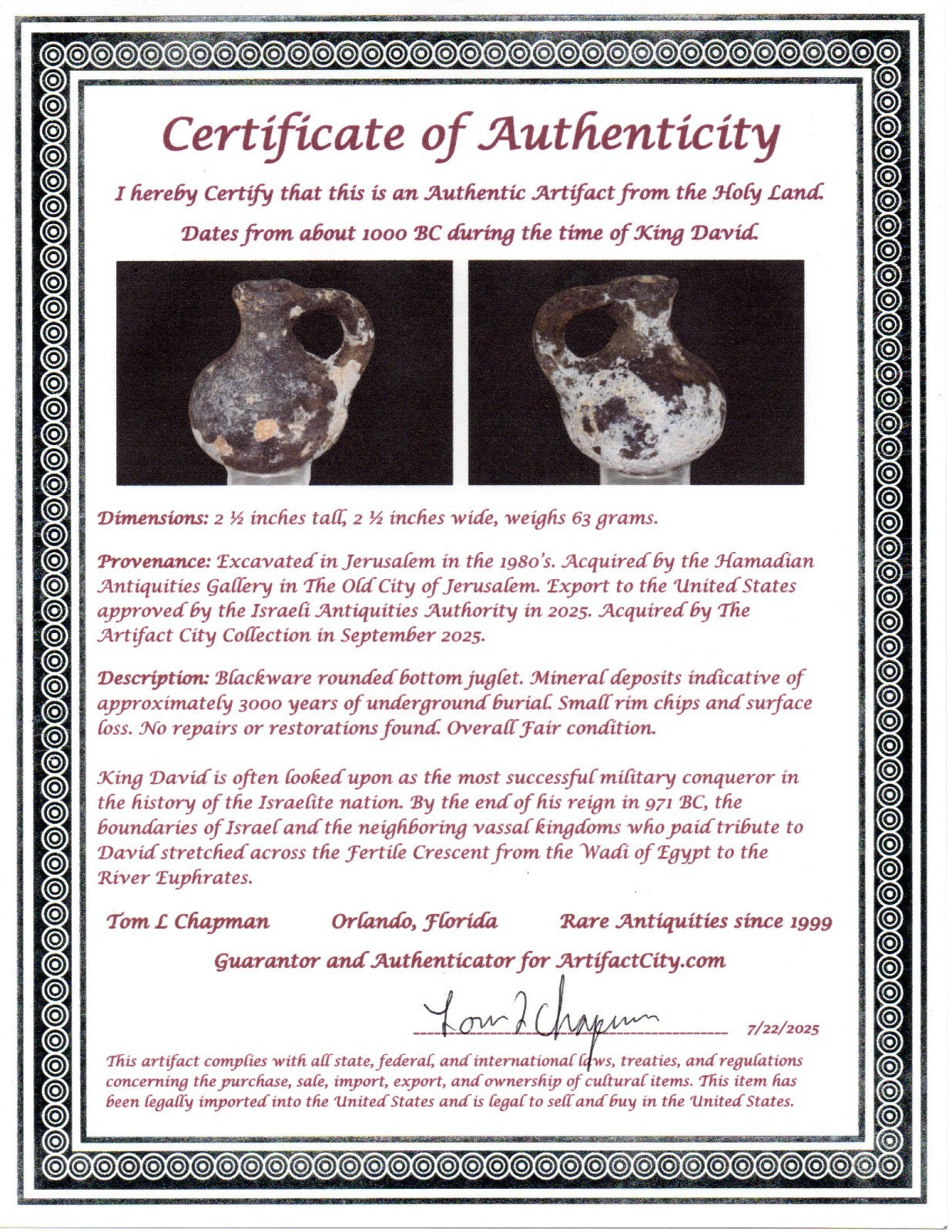 Ancient Holy Land Artifact King David Mini Jugglet Christ Home Land 1000BC COA 1