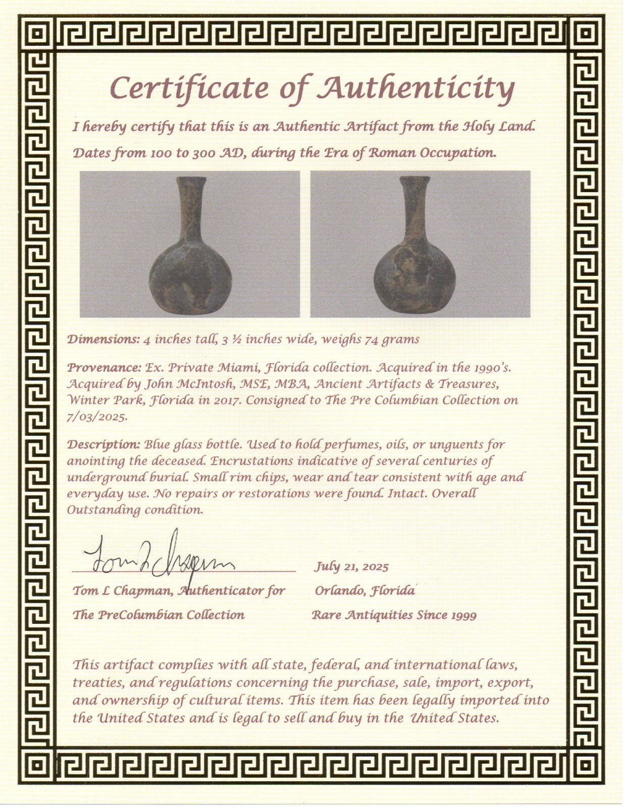 Ancient Holy Land Glass Bottle Authentic Artifact 100-300 AD Roman Era COA J21