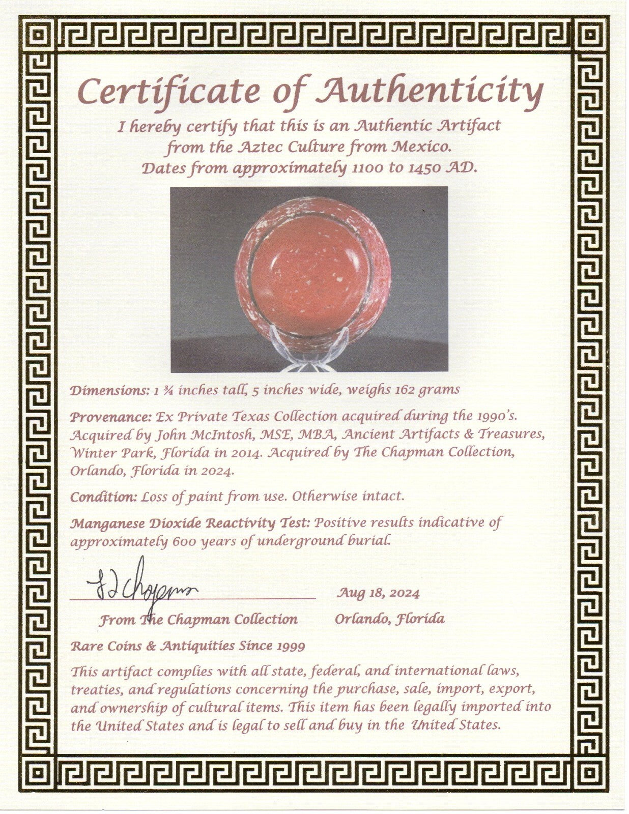 Many of the artifacts we sell are from Arte Primitivo at the Howard S Rose Gallery located in Midtown Manhattan, New York City. This is the most prestigious gallery of ancient artifacts in the United States. Artifacts sold by Arte Primitivo are the most sought after in the world. They are instantly recognized and respected by antiquities dealers and collectors alike as being the best of the best. Any item sold thru Arte Primitivo instantly increases in value due to the expertise of their staff at identifying and authenticating artifacts. They are the go to experts when it comes to ancient art.