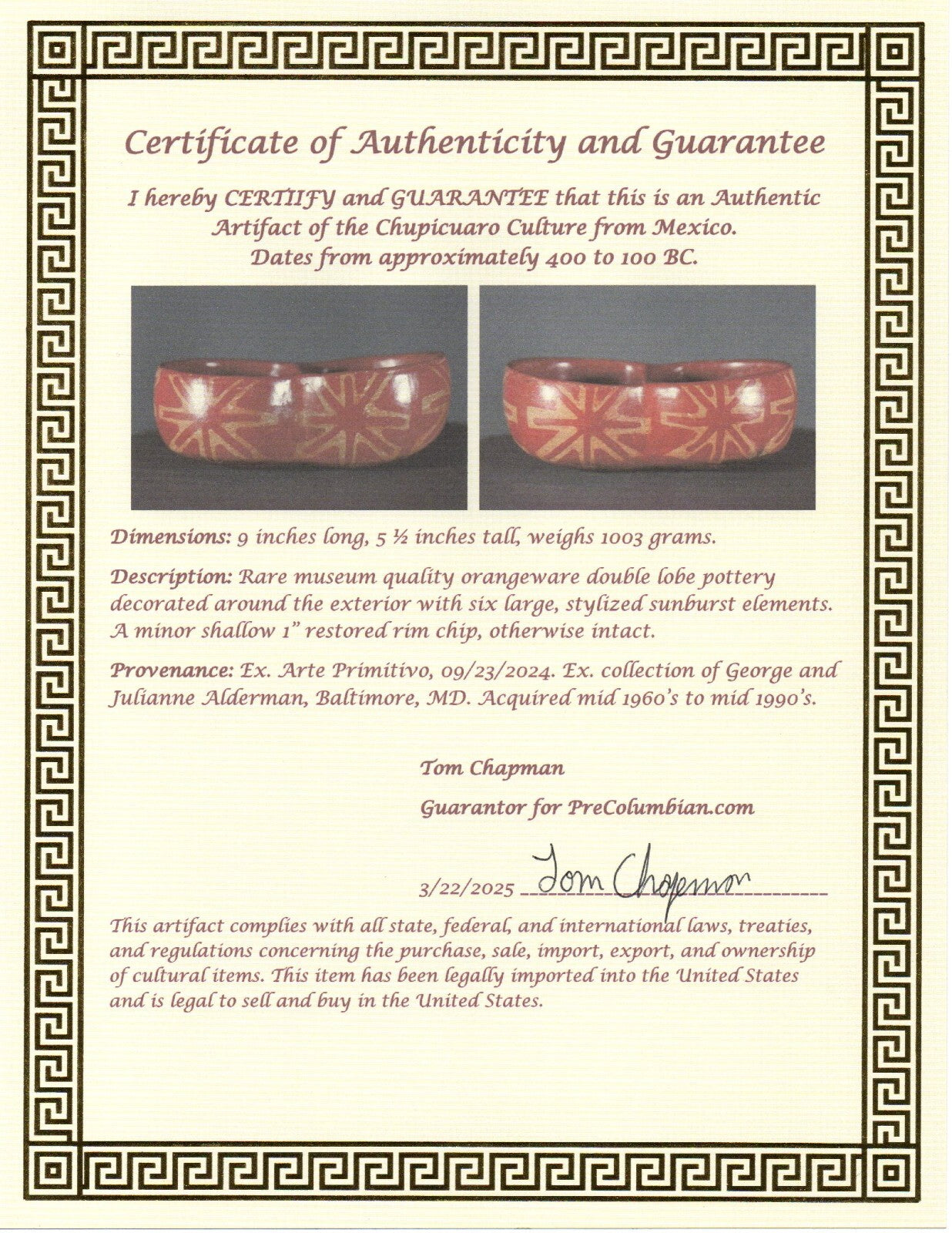 Many of the artifacts we sell are from Arte Primitivo at the Howard S Rose Gallery located in Midtown Manhattan, New York City. This is the most prestigious gallery of ancient artifacts in the United States. Artifacts sold by Arte Primitivo are the most sought after in the world. They are instantly recognized and respected by antiquities dealers and collectors alike as being the best of the best. Any item sold thru Arte Primitivo instantly increases in value due to the expertise of their staff at identifying and authenticating artifacts. They are the go to experts when it comes to ancient art.