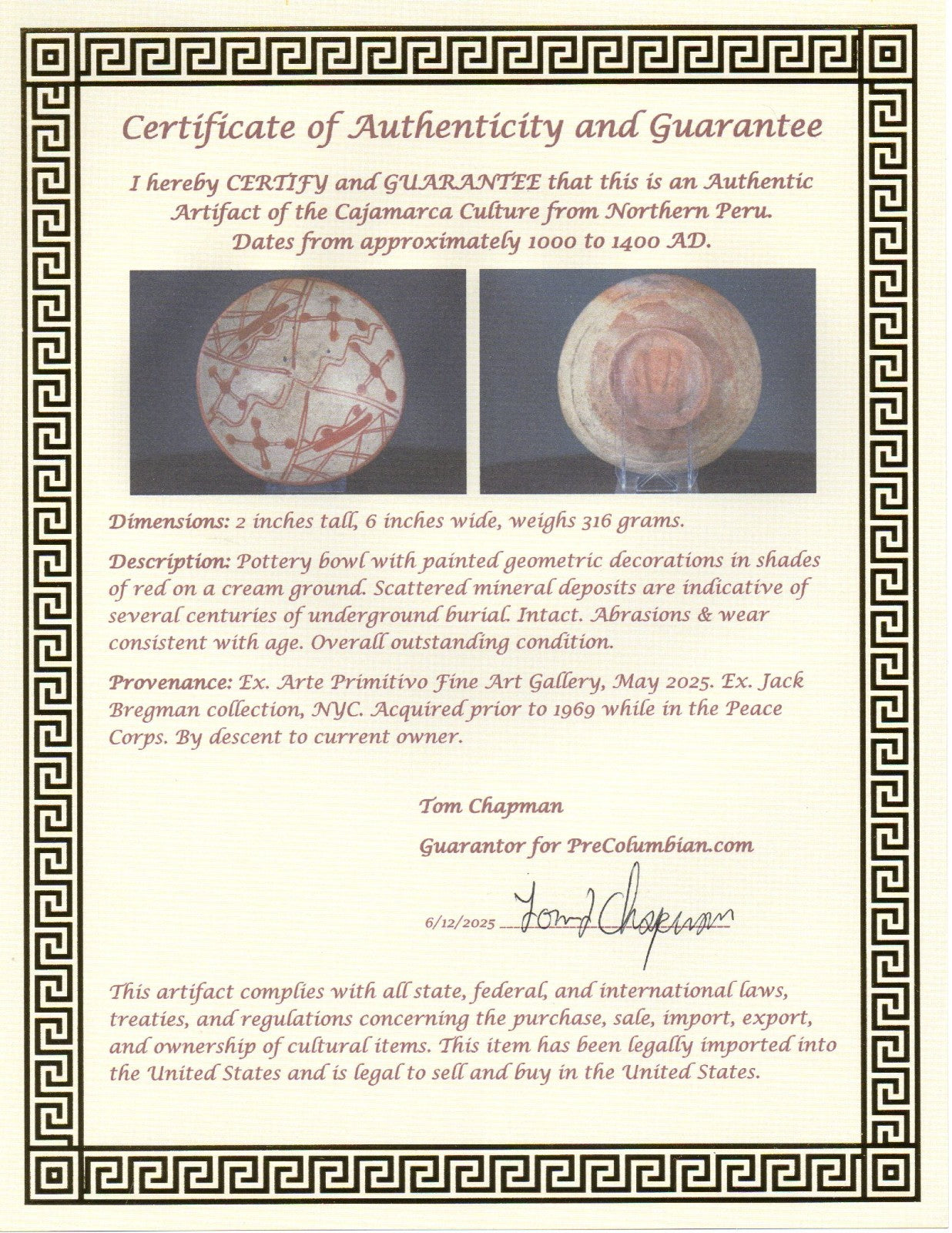 Many of the artifacts we sell are from Arte Primitivo at the Howard S Rose Gallery located in Midtown Manhattan, New York City. This is the most prestigious gallery of ancient artifacts in the United States. Artifacts sold by Arte Primitivo are the most sought after in the world. They are instantly recognized and respected by antiquities dealers and collectors alike as being the best of the best. Any item sold thru Arte Primitivo instantly increases in value due to the expertise of their staff at identifying and authenticating artifacts. They are the go to experts when it comes to ancient art.