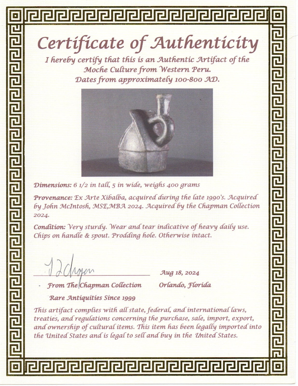 Many of the artifacts we sell are from Arte Primitivo at the Howard S Rose Gallery located in Midtown Manhattan, New York City. This is the most prestigious gallery of ancient artifacts in the United States. Artifacts sold by Arte Primitivo are the most sought after in the world. They are instantly recognized and respected by antiquities dealers and collectors alike as being the best of the best. Any item sold thru Arte Primitivo instantly increases in value due to the expertise of their staff at identifying and authenticating artifacts. They are the go to experts when it comes to ancient art.