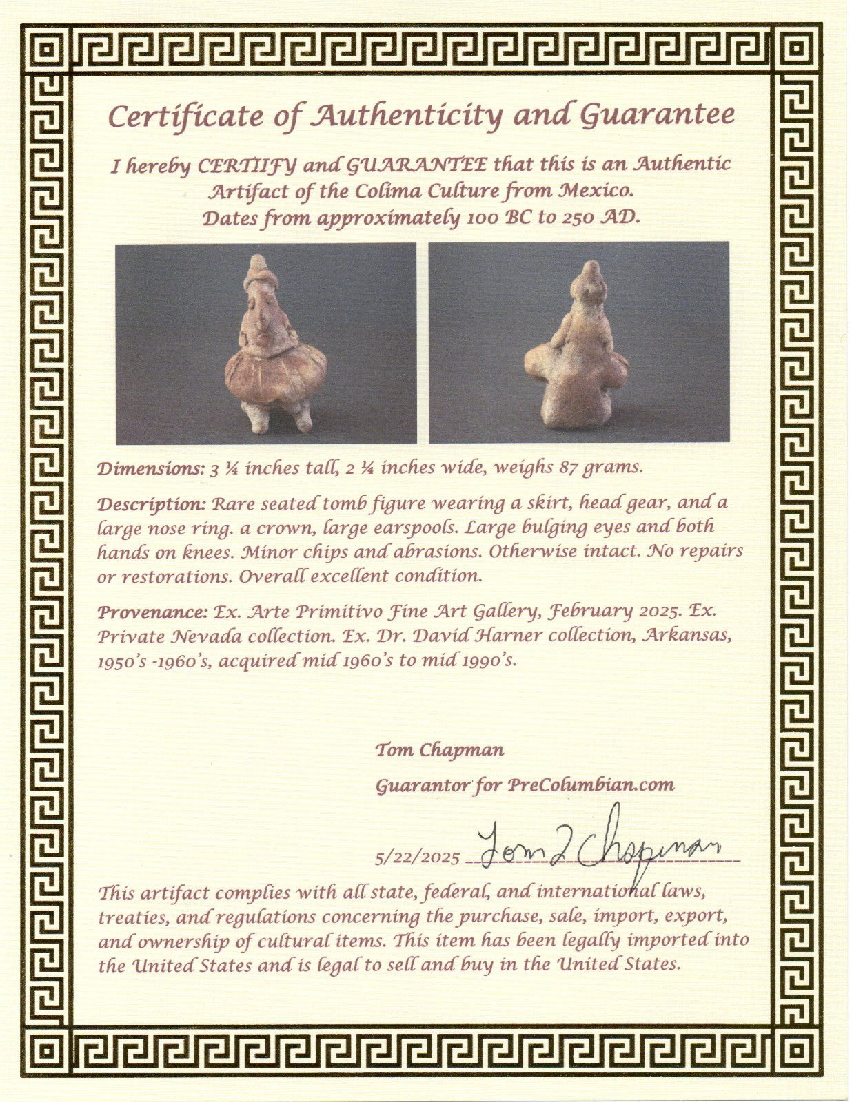 Many of the artifacts we sell are from Arte Primitivo at the Howard S Rose Gallery located in Midtown Manhattan, New York City. This is the most prestigious gallery of ancient artifacts in the United States. Artifacts sold by Arte Primitivo are the most sought after in the world. They are instantly recognized and respected by antiquities dealers and collectors alike as being the best of the best. Any item sold thru Arte Primitivo instantly increases in value due to the expertise of their staff at identifying and authenticating artifacts. They are the go to experts when it comes to ancient art.