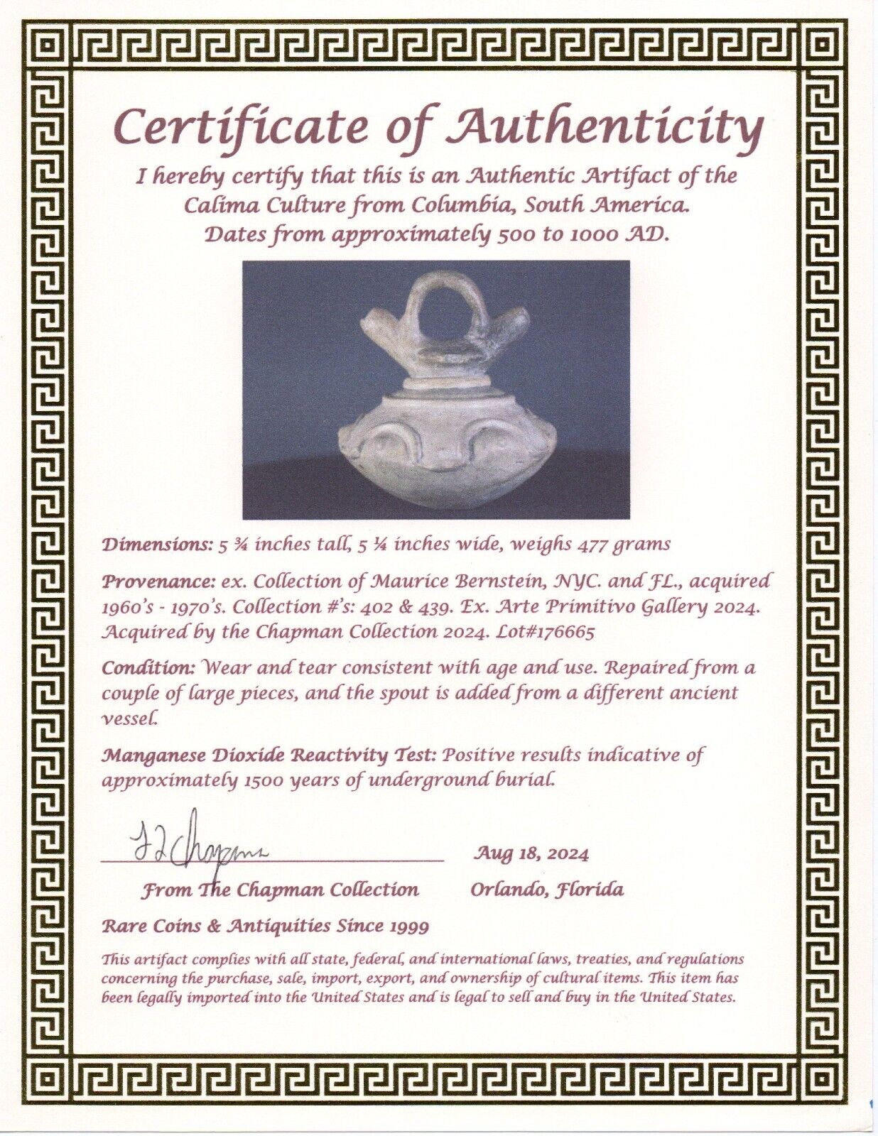 Authentic Pre Columbian Artifact Stirrup Jar Calima Ex Arte Primitivo AD T37