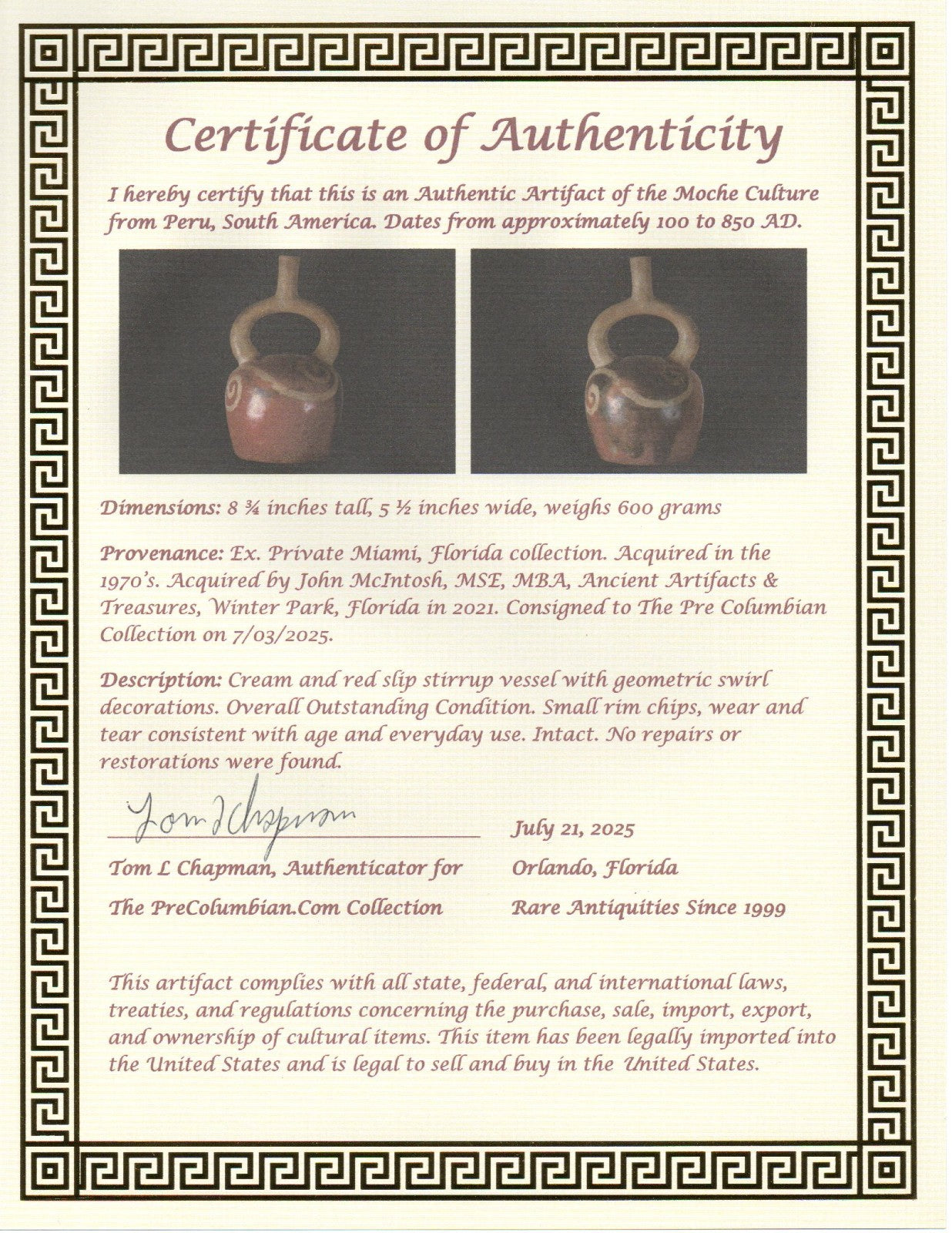 Pre Columbian Authentic Artifact Stirrup Vessel Moche Peru 100-850 AD COA J05