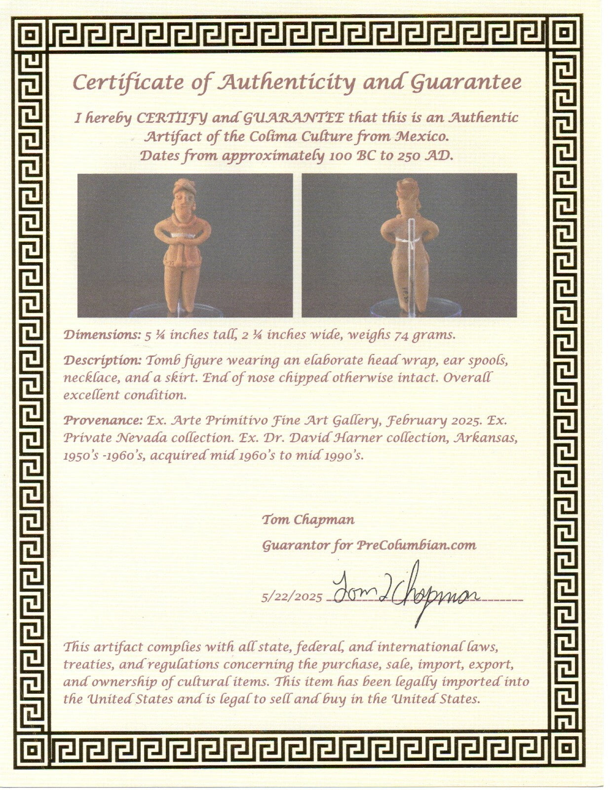 Many of the artifacts we sell are from Arte Primitivo at the Howard S Rose Gallery located in Midtown Manhattan, New York City. This is the most prestigious gallery of ancient artifacts in the United States. Artifacts sold by Arte Primitivo are the most sought after in the world. They are instantly recognized and respected by antiquities dealers and collectors alike as being the best of the best. Any item sold thru Arte Primitivo instantly increases in value due to the expertise of their staff at identifying and authenticating artifacts. They are the go to experts when it comes to ancient art.